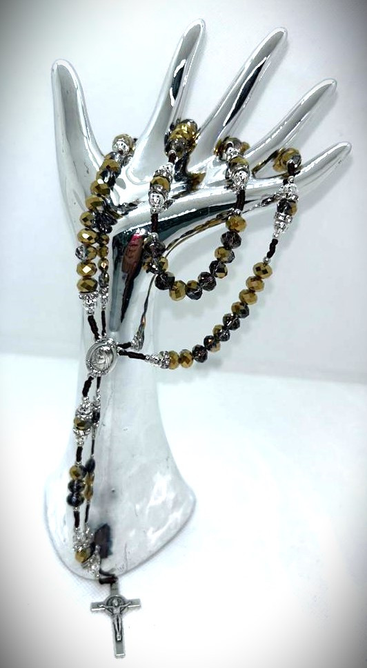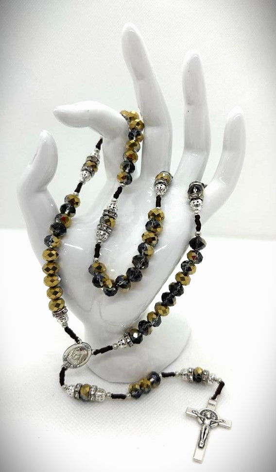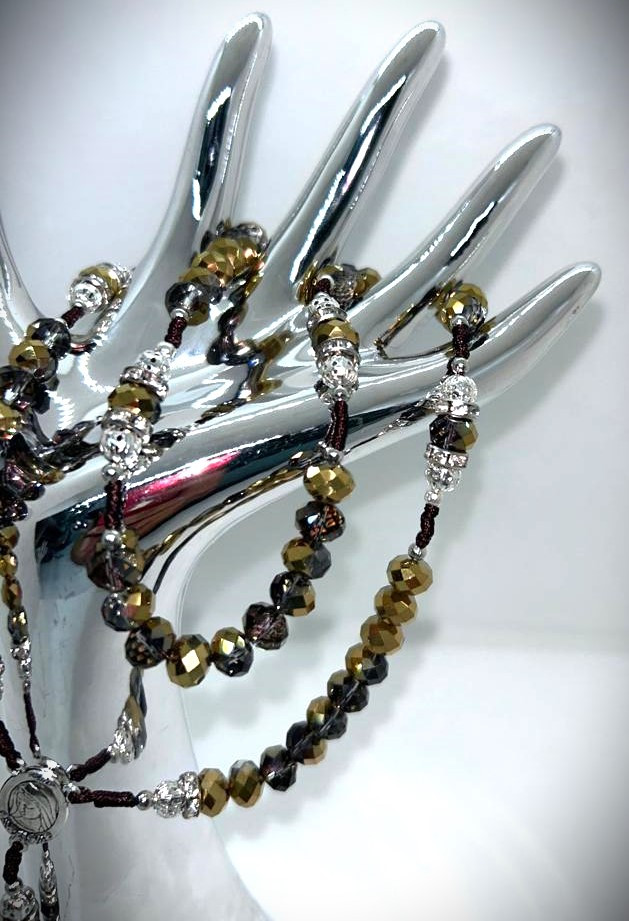 Ručno rađena krunica od kristala i posrebrenih perli sa svilenim koncem