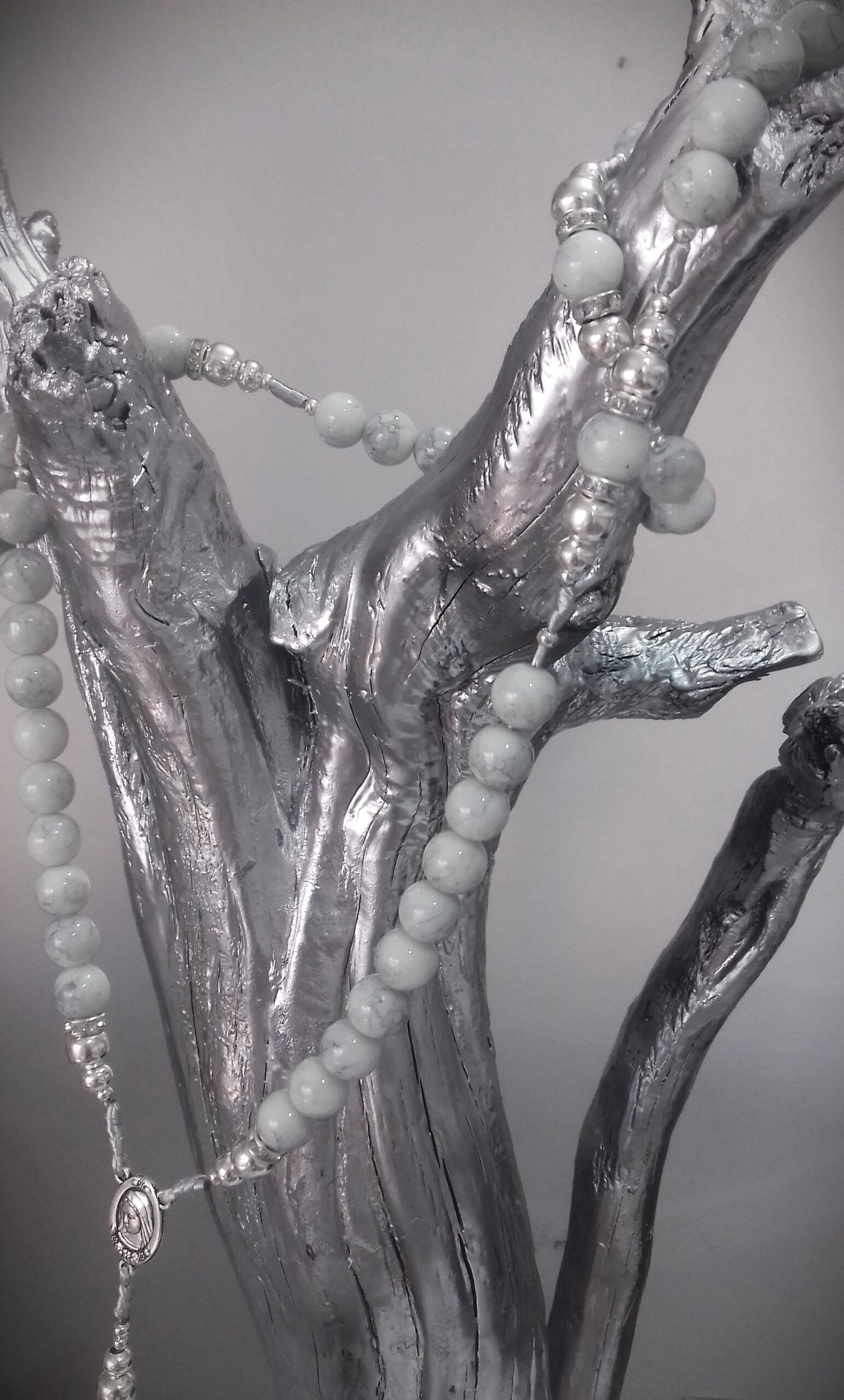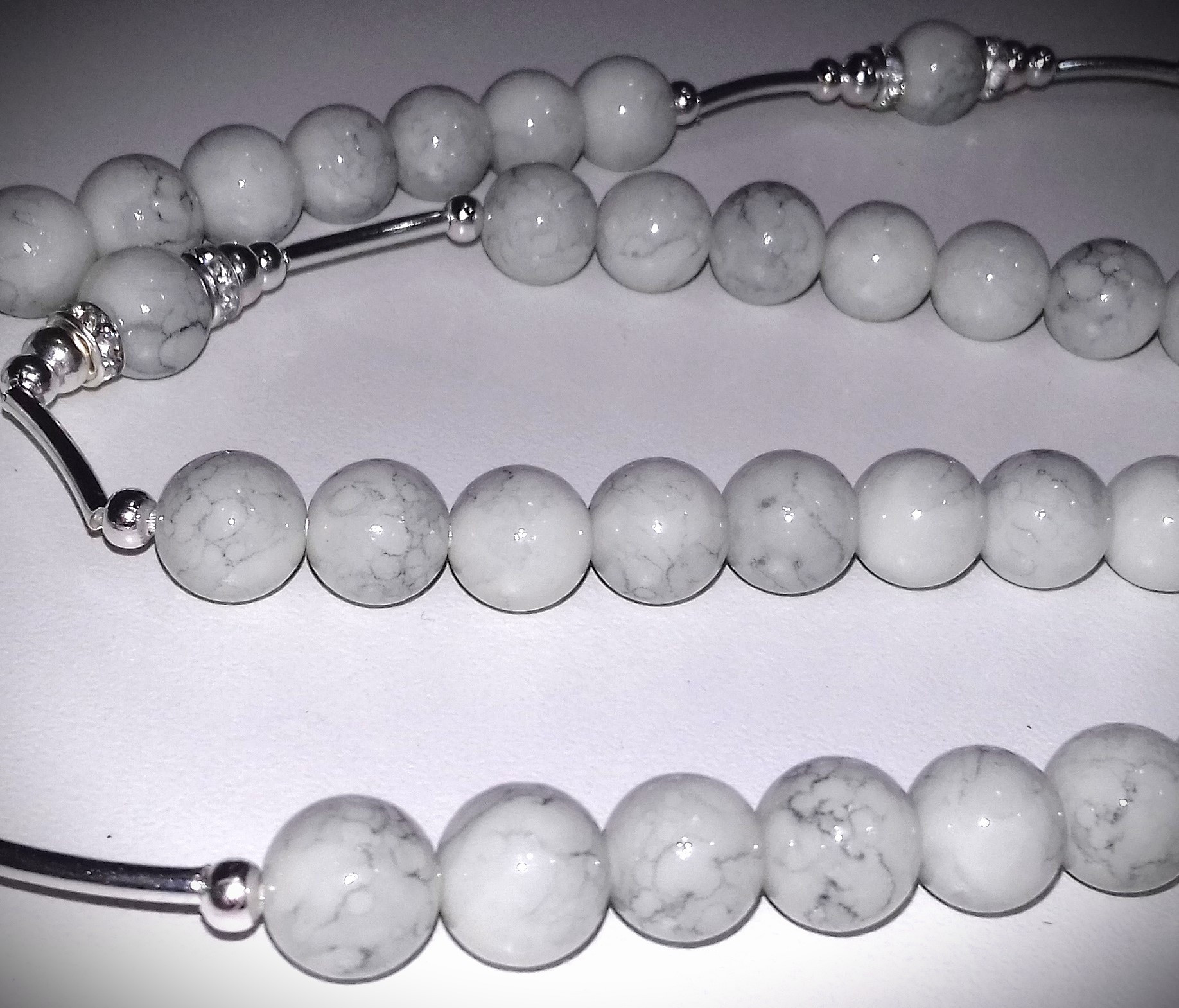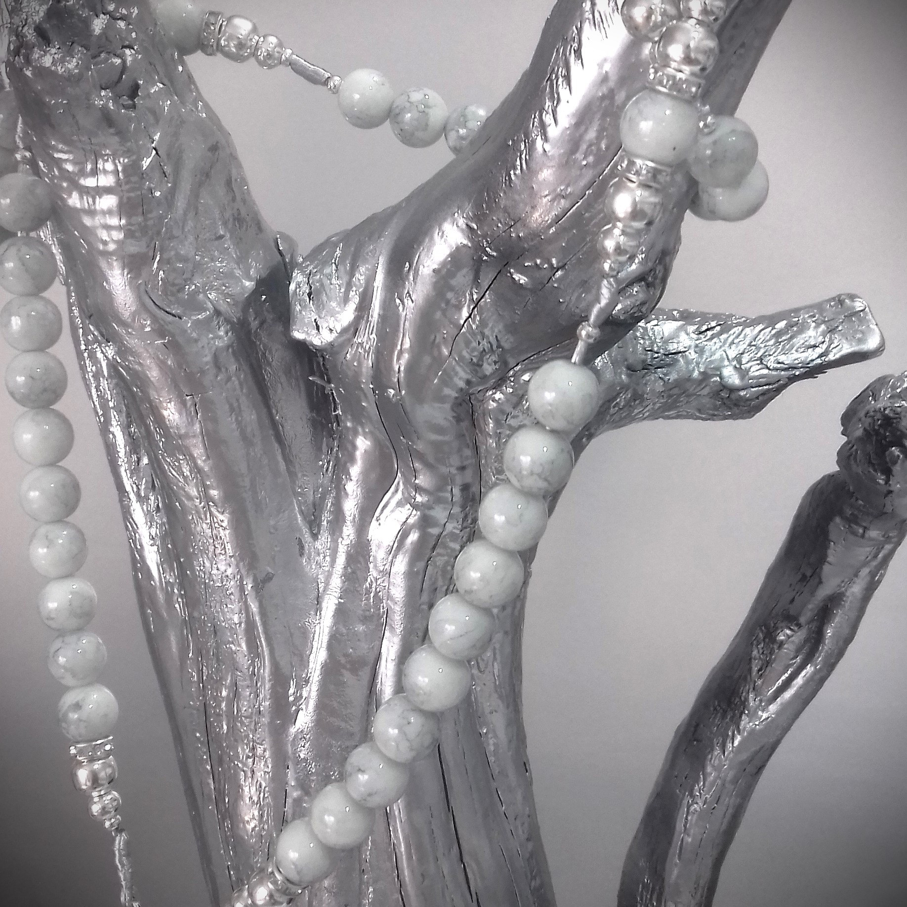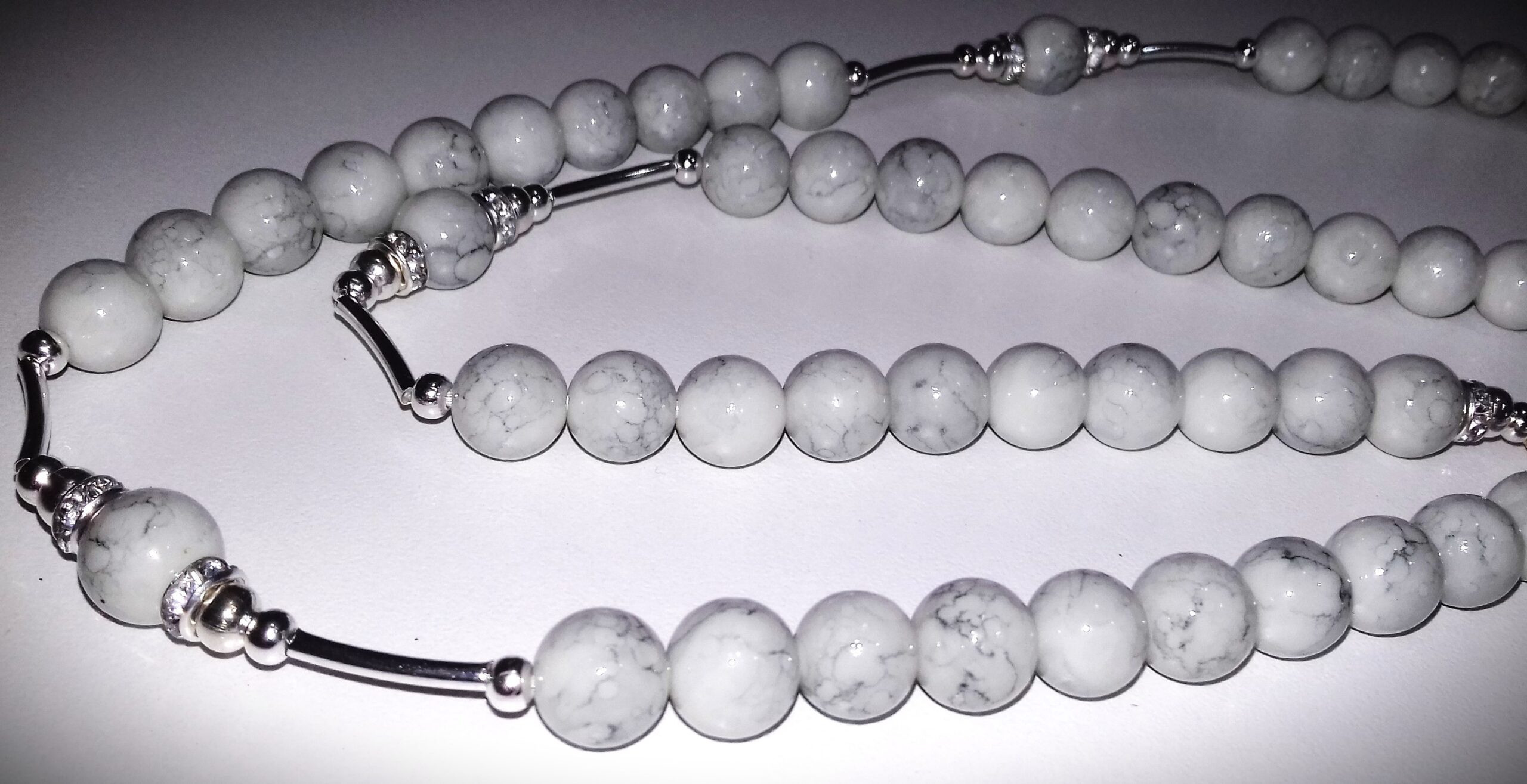 Ručno rađena krunica od kamena i posrebrenih perli sa svilenim koncem