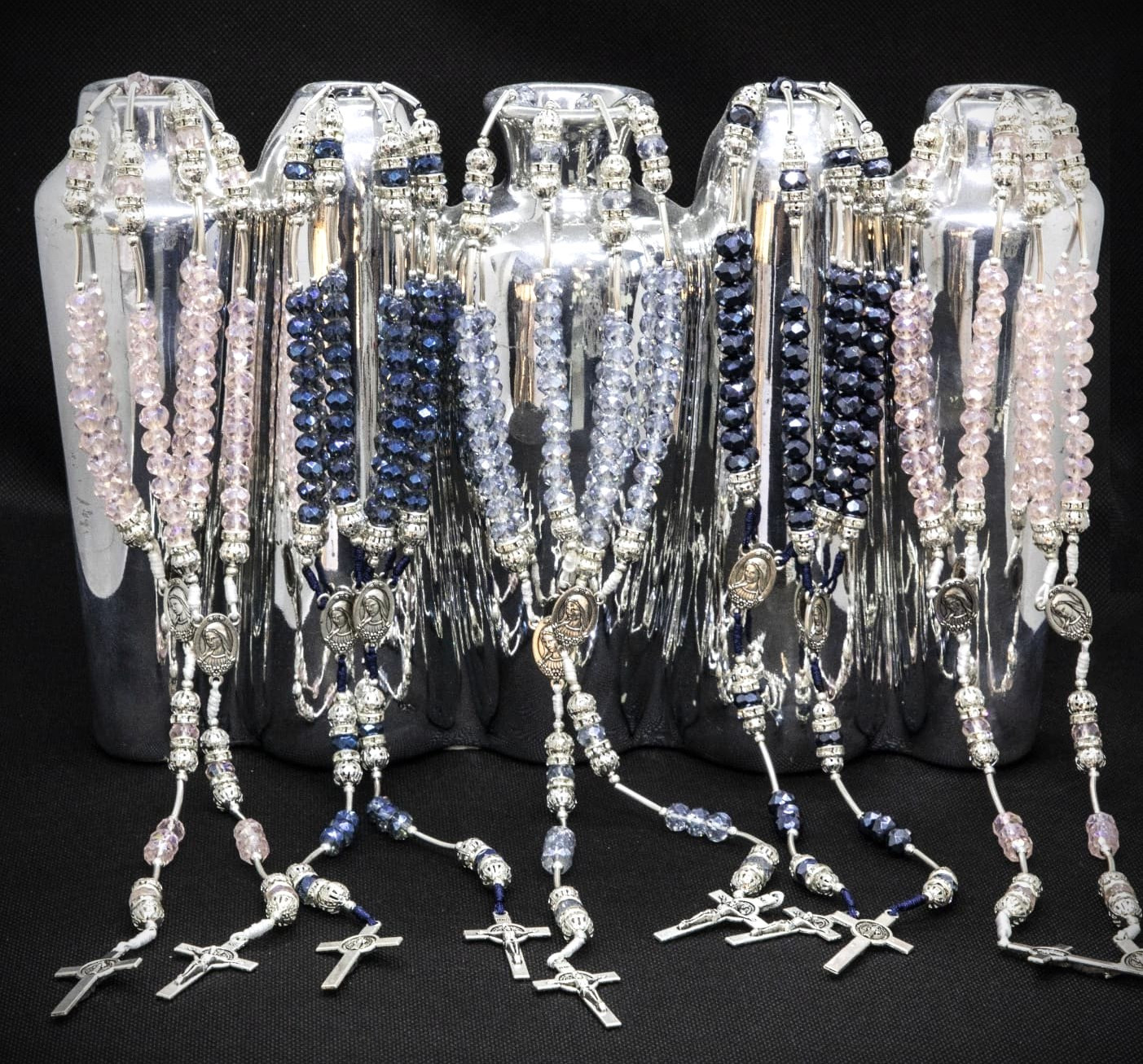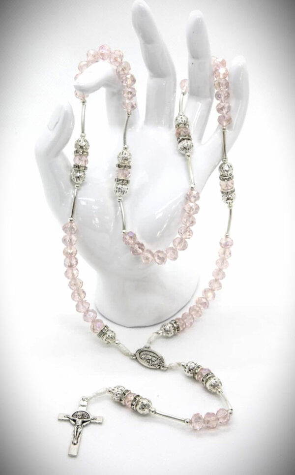 Ručno rađena krunica od kristala i posrebrenih perli sa svilenim koncem.