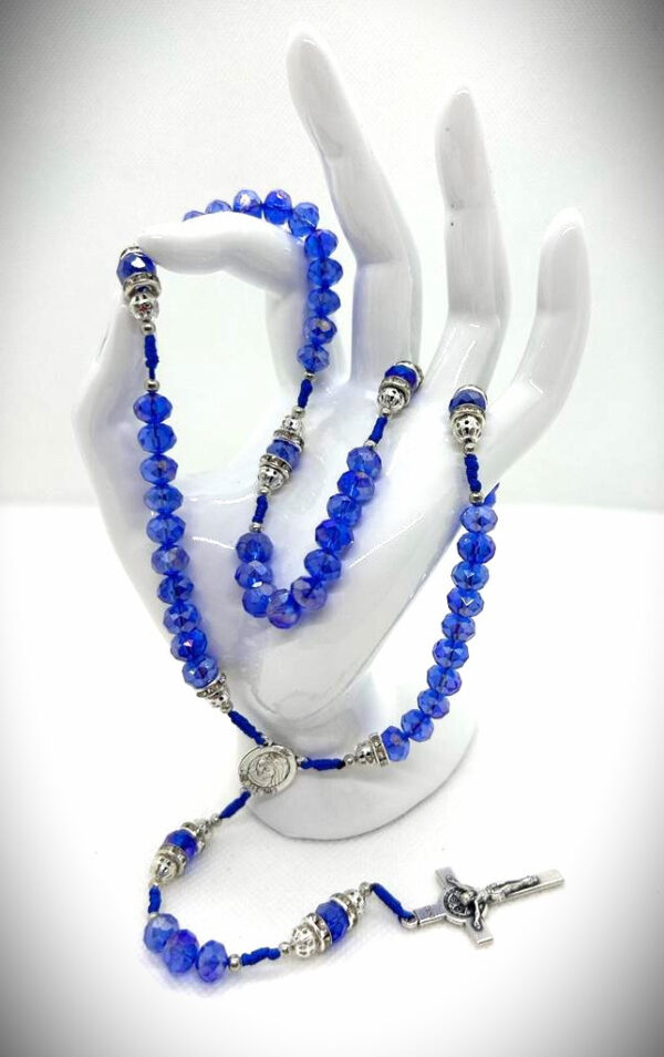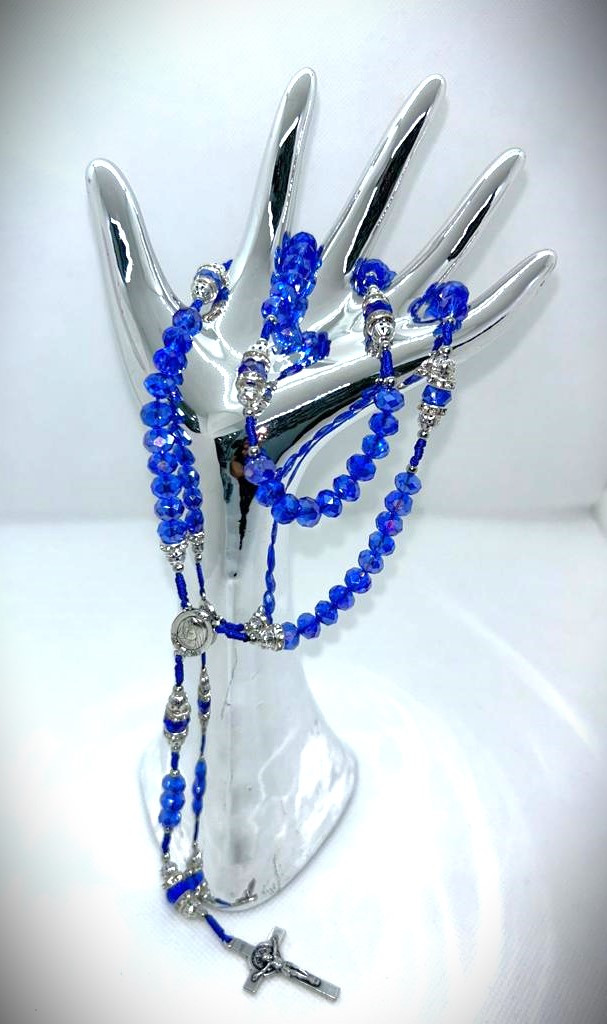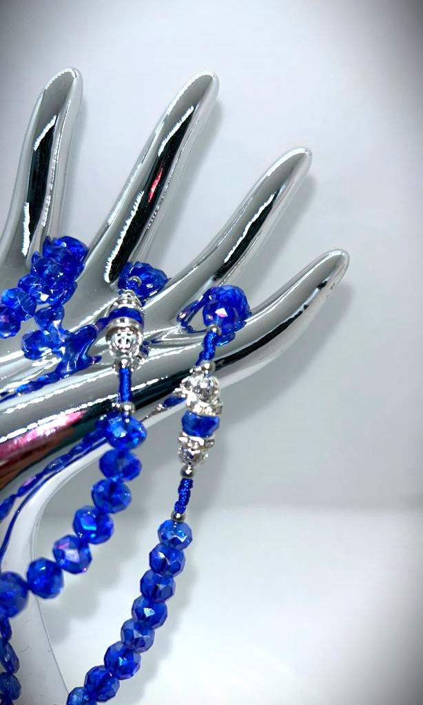 Ručno rađena krunica od kristala i posrebrenih perli sa svilenim koncem.