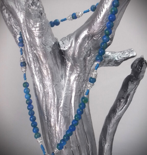 Ručno rađena krunica od stakla i posrebrenih perli sa svilenim koncem.