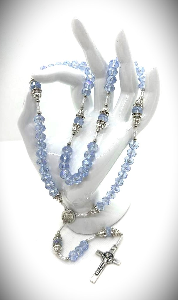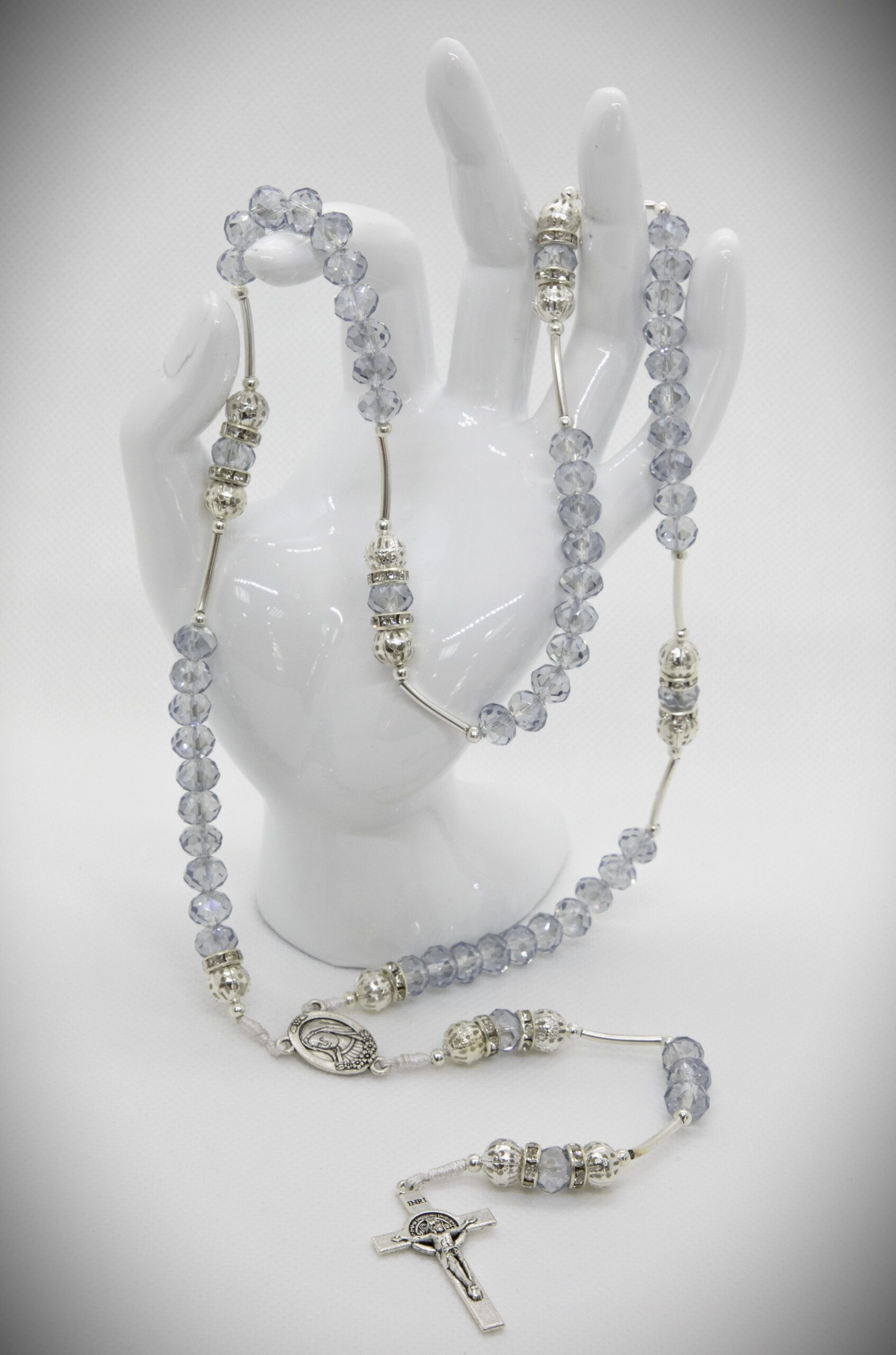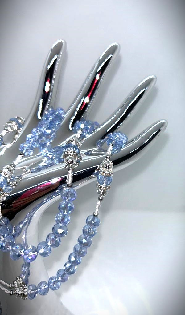 Ručno rađena krunica od kristala i posrebrenih perli sa svilenim koncem.