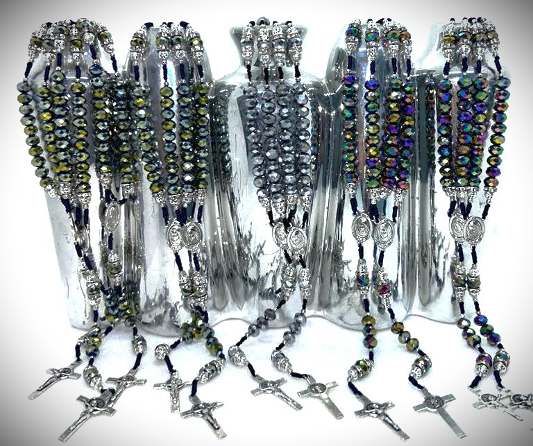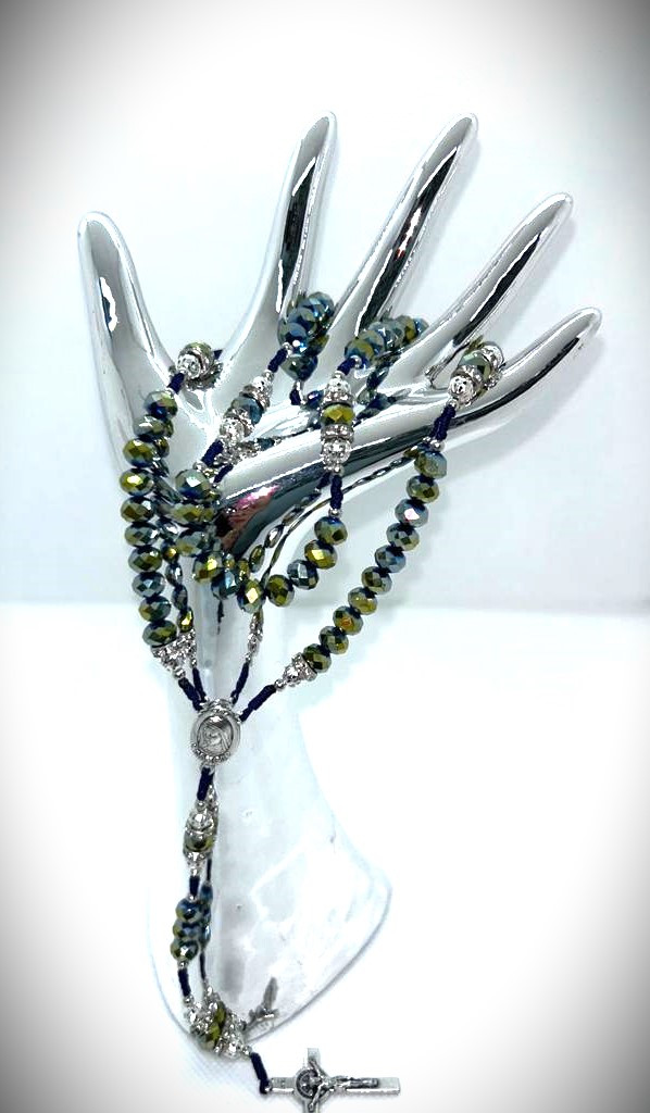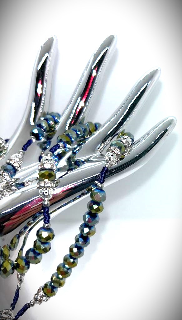 Ručno rađena krunica od kristala i posrebrenih perli sa svilenim koncem.