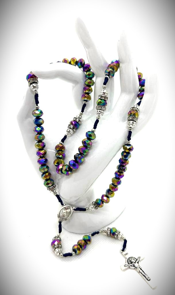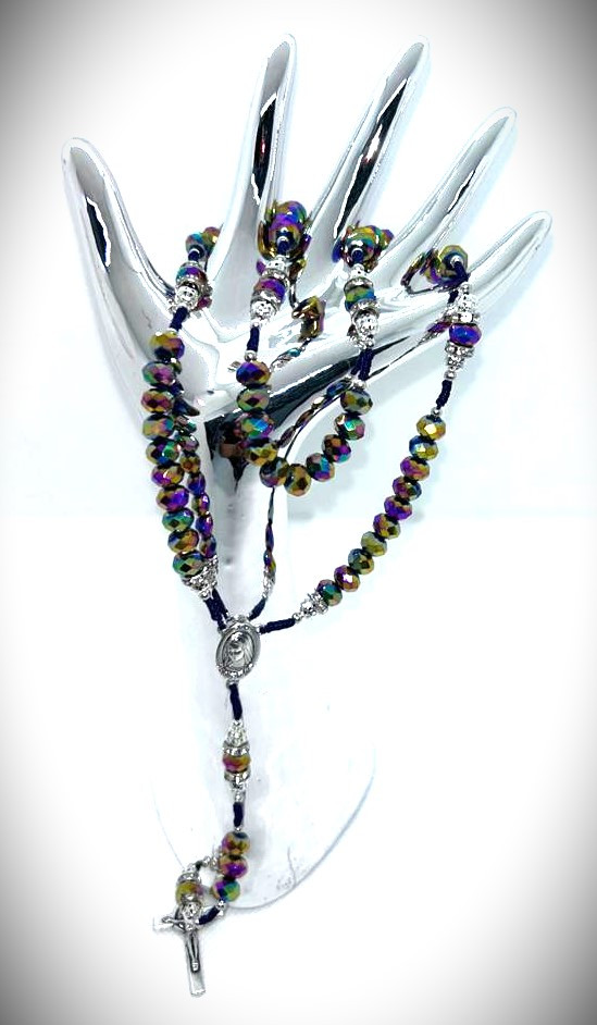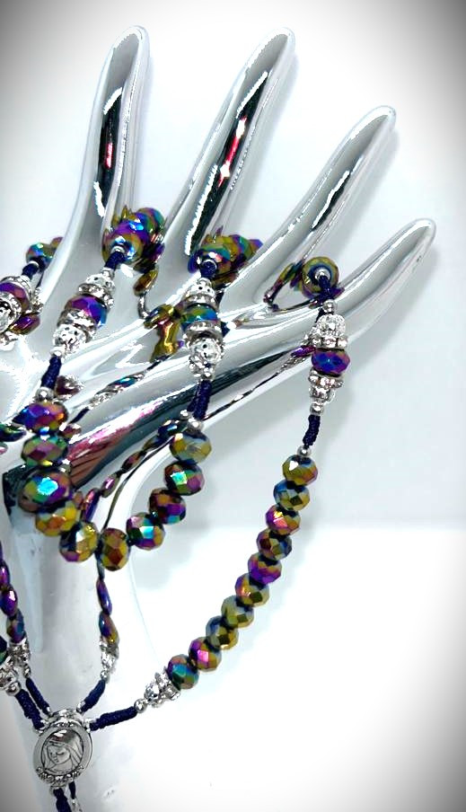 Ručno rađena krunica od kristala i posrebrenih perli sa svilenim koncem.